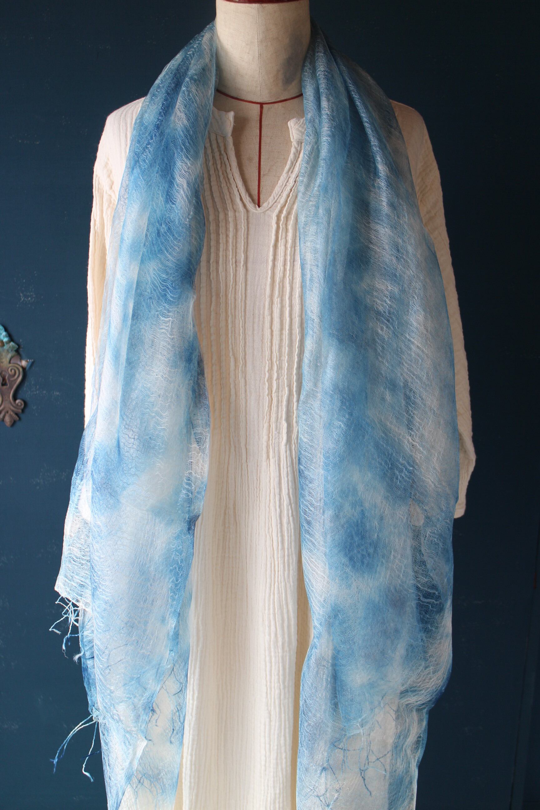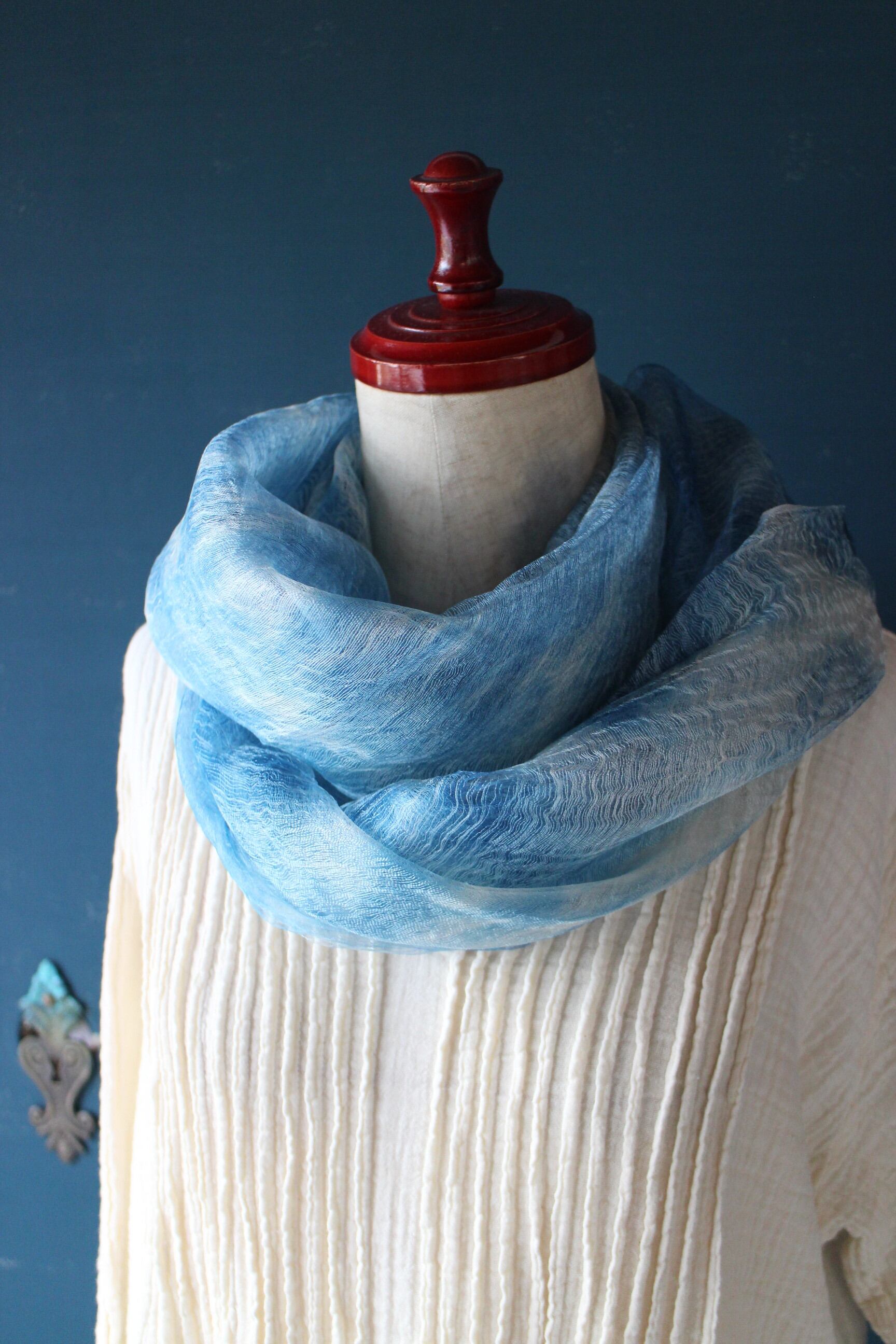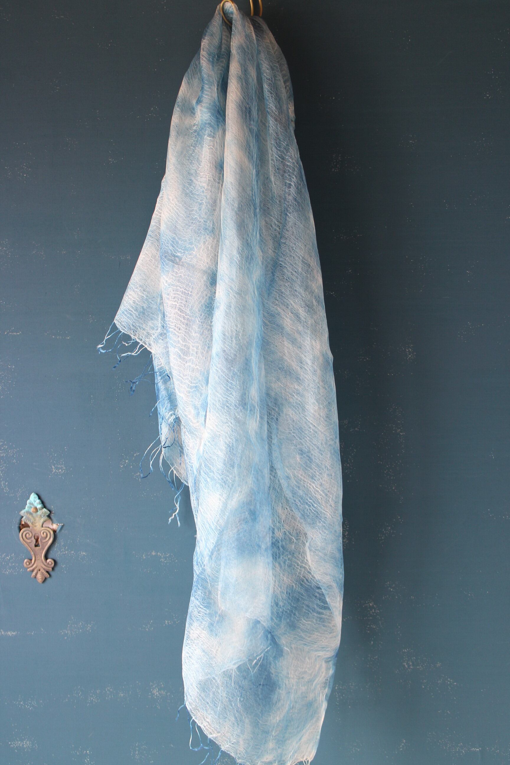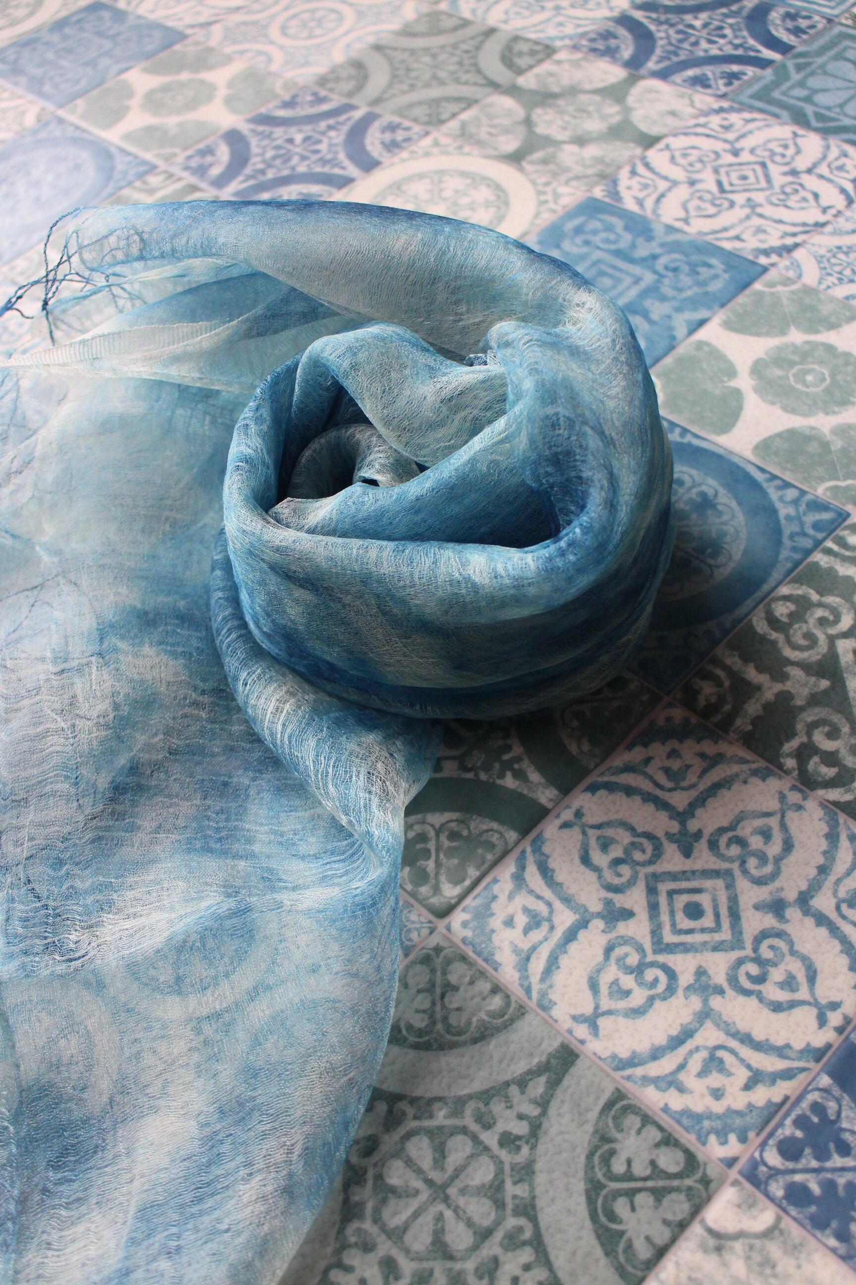 絞って藍染した美しいシルクスカーフ。