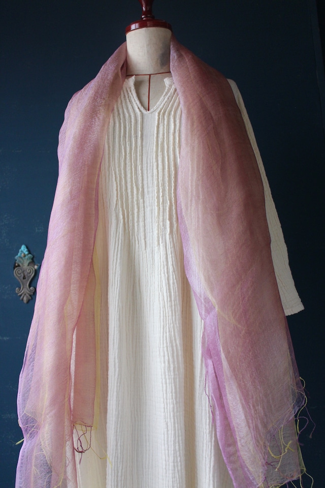 草木染めシルクスカーフ ダブルに織られたスカーフを一枚づつ違う色で染めているので、重ねた時美しい玉虫色が生まれます。 コチニールで染めた美しい赤紫と、山桃で染めた鮮やかな黄色。 シルク100% 大きめサイズで沢山の巻き方が楽しめます。 70×190 染色家松本万里子が一枚づつ手染めしています。 ご自宅でのお手入れ、手洗いアイロンかけが可能です。