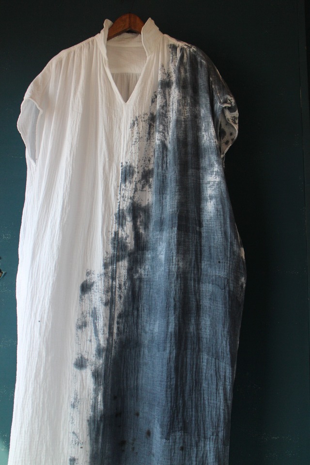 ダブルガーゼ素材のワンピースに藍染でペイントしました。 ペンキの刷毛で藍でペイントしたワンピースです。一発勝負で書いています。完全な一点ものになります。バインダーを混ぜて染色しているのでお洗濯による色落ちは少なめです。 肌触りの良いダブルガーゼで洗濯するごとに風合いが良くなります。 お手入れ方法:手洗い 素材:コットン100% 染色家松本万里子が一枚づつ手染めしています。