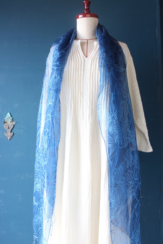 藍の色が美しいシルクスカーフ。 作家が一枚づつ手染めしています。 お花の柄のプリントがアクセントです。 先端にビーズがついており、重さが出て風に飛びにくいです。 ご自宅でのお手入れが可能。手洗い、アイロンかけ出来ます。 こちはら藍染になりますので、他の白物との併用の際は色移りなどに十分お気をつけください。 お洗濯は中性洗剤(オシャレ着洗い)での単品手洗い、水洗いをおすすめしています。 アイロンかけは高アイロンで当て布なしでかけてください。スチームもオッケー。 シルク100% 60×195cm made in Japan
