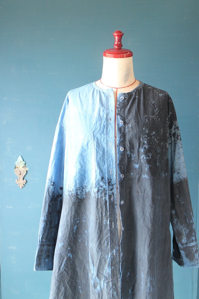 藍染のあと、ペンキの刷毛で墨でペイントしたシャツです。一発勝負で書いています。完全な一点ものになります。しっかり色止めされているのでお洗濯による色落ちはありません。 後ろ裾にストリングス(ゴム紐)が通してあり絞り気味にするとシルエットがバルーンのようになります。 お手入れ方法:手洗い 素材:コットン100% 染色家松本万里子が一枚づつ手染めしています。